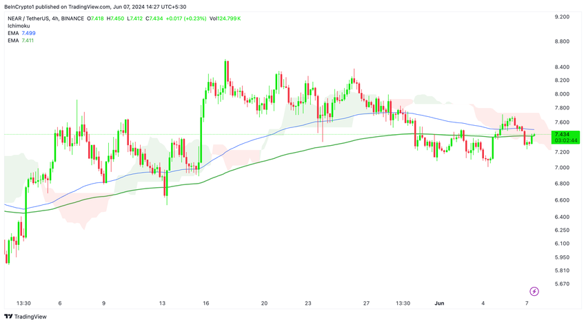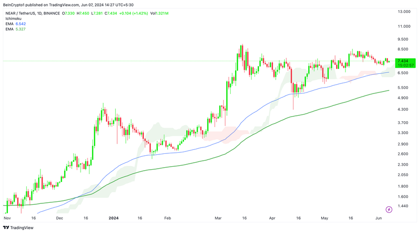 Så lenge NEAR holder seg over Ichimoku-skyen på det daglige diagrammet, bør du opprettholde en bullish holdning. Skyen fungerer som en dynamisk støttesone som forsterker den generelle oppadgående trenden.