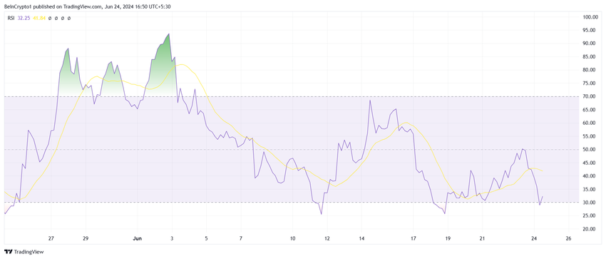 Til tross for at den er i en oversolgt tilstand, kan Notcoins utvinning bli forsinket. Vanligvis signaliserer en oversolgt RSI en potensiell sprett-tilbake, men det vedvarende salgspresset antyder langvarig svakhet.