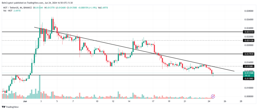 Notcoins pris på $0,0135 har allerede ikke klart å bryte nedtrendlinjen en gang denne uken. Telegram-tokenet kan nå falle under nøkkelstøttegulvet på $0,0130. Gitt at dette nivået har blitt testet tidligere, er det en sjanse for at altcoinen kan finne litt motstand.
