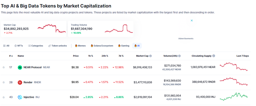 Økningen var en typisk “kjøp ryktet”-situasjon, og i en typisk “selg hendelsen”-reaksjon falt disse tokens. AI-krypto-myntenes handelsvolum er opp 10 % for å vise massiv fortjenestebestilling. Med dette har AI-kryptovalutaers markedsverdi falt med nesten 3 % til 34,8 milliarder dollar.