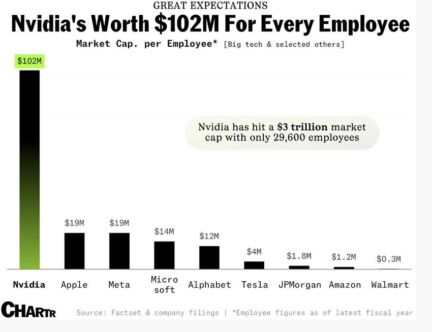 “NVIDIA bryter $ 3 TRILLIONER markedsverdi og er nå verdt $ 102 millioner for hver ansatt,” fremhevet kryptovaktverktøyet Radar i et innlegg.