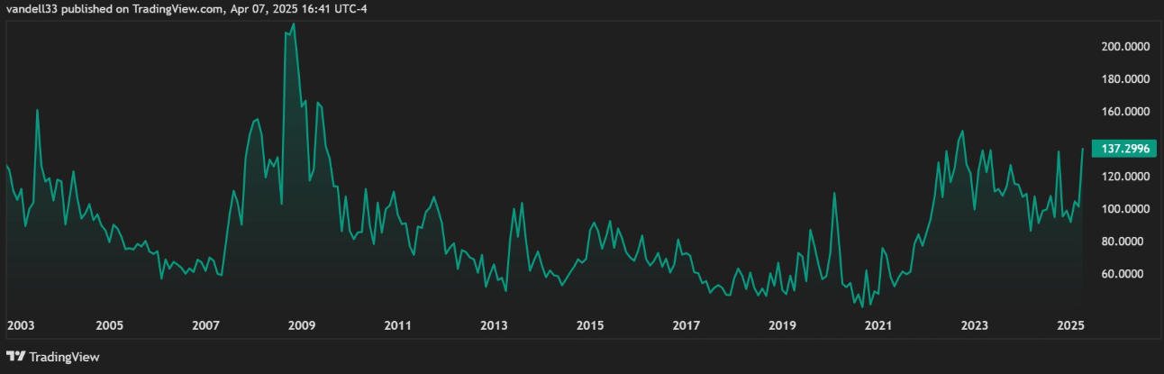 Analytikere har delt grunner som kan få Fed til å gripe inn, med en som nevner MOVE-indeksen. Dette er Wall Streets “fryktindeks” for obligasjonsmarkedet. På 137,30 er indeksen for øyeblikket innenfor 130–160-området der Fed historisk har handlet under kriser.