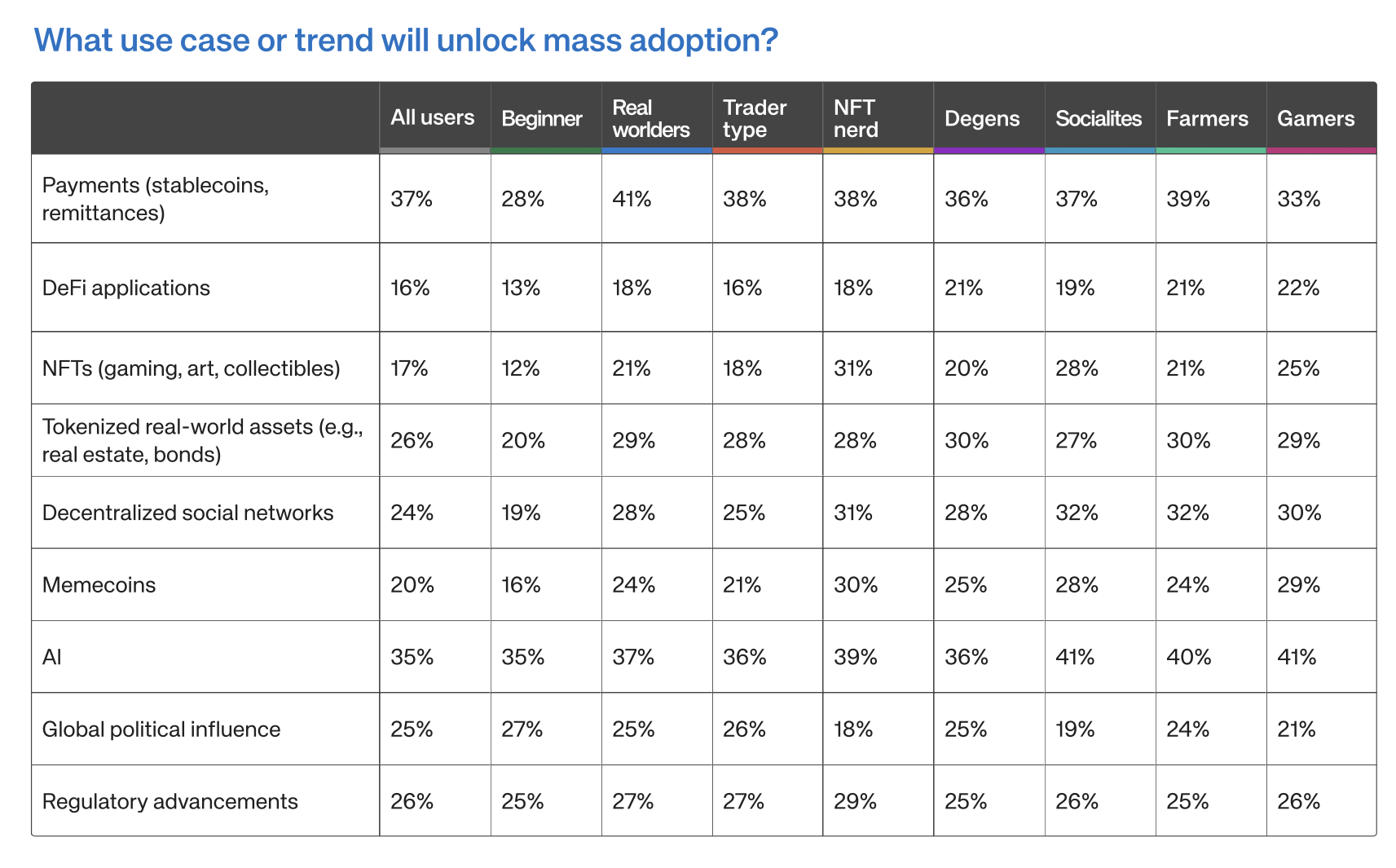 “Til tross for at handel tar kronen når det gjelder brukeraktivitet i dag, dominerer betalinger og AI som de to temaene brukerne føler vil spille større roller i større skala, noe som tyder på at de ledende tjenestene brukerne har tilgang til i dag ikke gjenspeiler det de tror vil drive dens langsiktige verdi,” leste rapporten.