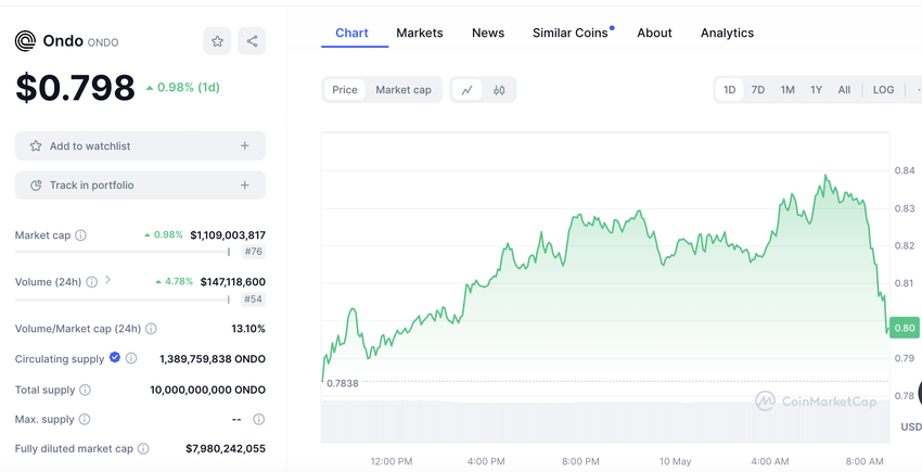 Kunngjøringen hadde en positiv innvirkning på Ondo Finances opprinnelige token, ONDO, som steg 6% fra $ 0,76 til $ 0,83 før den stabiliserte seg på $ 0,80. I tillegg økte ONDOs handelsvolum med 4,78%, og markedsverdien økte med 0,98% og nådde 1,10 milliarder dollar.