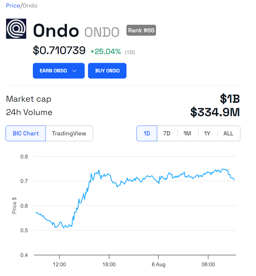 ONDO, den opprinnelige tokenen til Ondo Finance, har steget med 25,04 % de siste 24 timene og handles nå til $0,71. Imidlertid har ONDOs pris sett en lengre nedgang på 25 %, etter å ha blitt handlet til $0,95 1. august før den falt til $0,52 under gårsdagens markedsnedsmelting.
