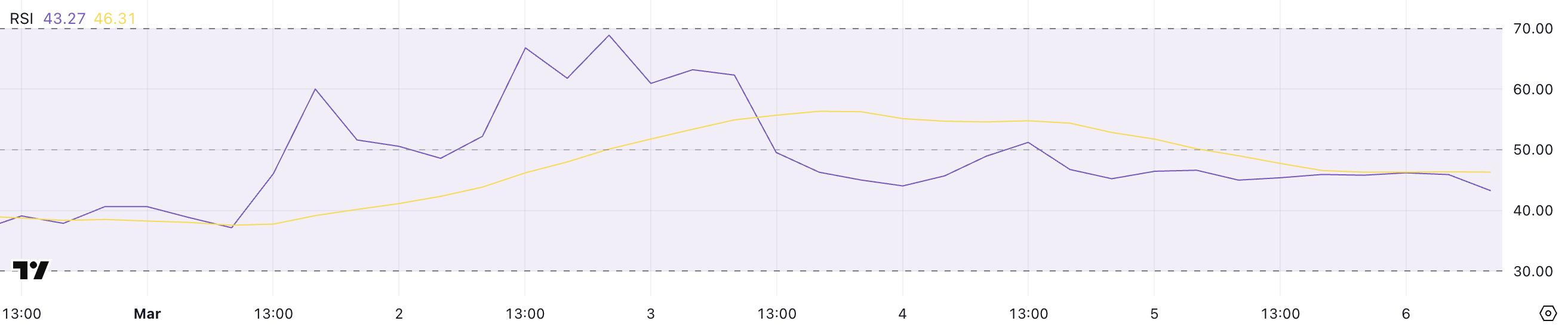 Onyxcoin har en RSI på 43,2, ned fra sin nylige topp på 68,9 den 2. mars.