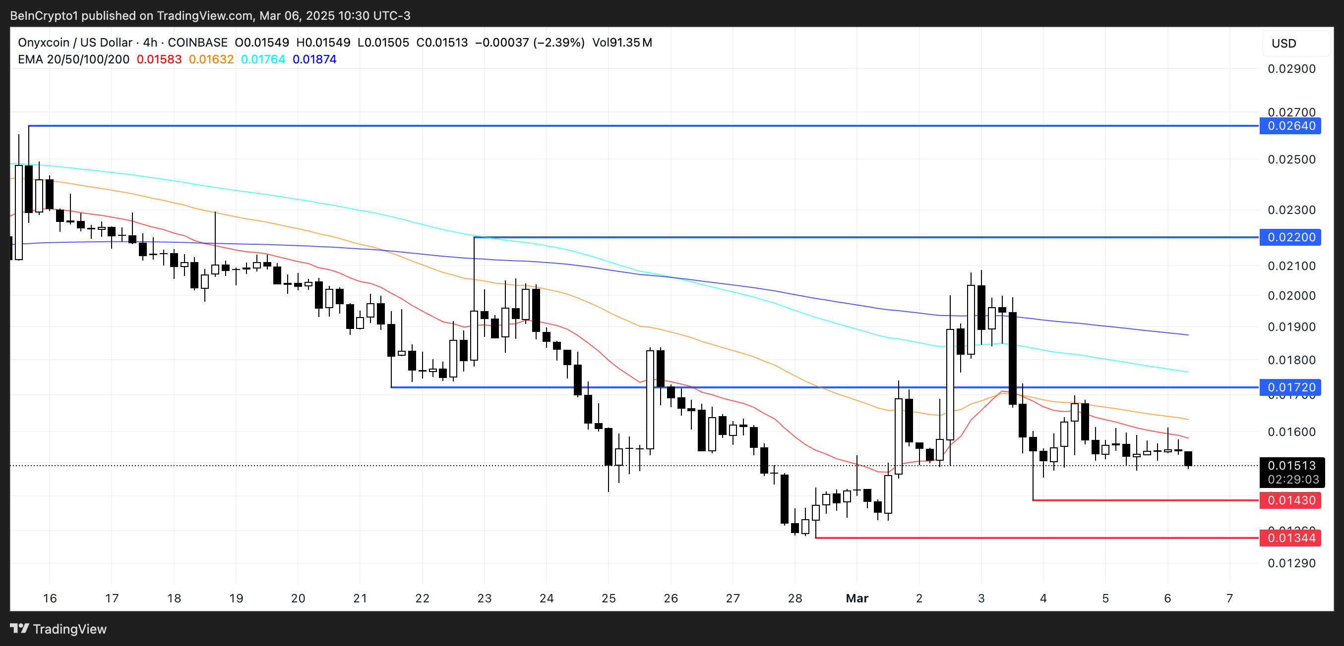 Etter en historisk oppgang i januar, da XCN var en av de best presterende altcoins i markedet, handles Onyxcoin nå mellom motstand på $ 0,017 og støtte på $ 0,0143. Dens EMA-linjer viser en bearish trend ettersom kortsiktige EMA-er forblir under langsiktige.