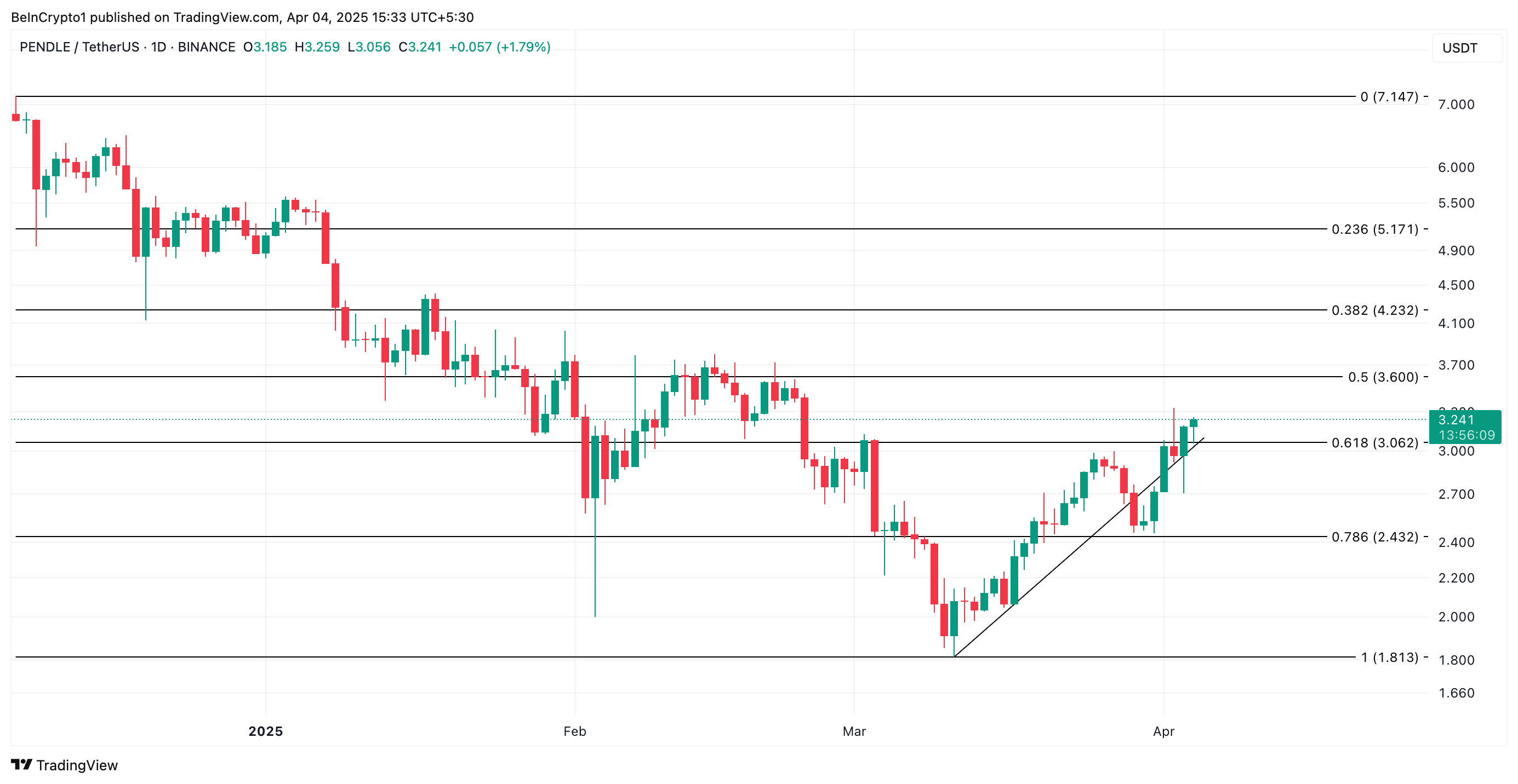 Siden oppgangen begynte den 11. mars, har PENDLE handlet over en stigende trendlinje. Dette mønsteret dannes når en serie høyere bunner kobles sammen, noe som indikerer at prisen på en aktiva konsekvent stiger over tid.