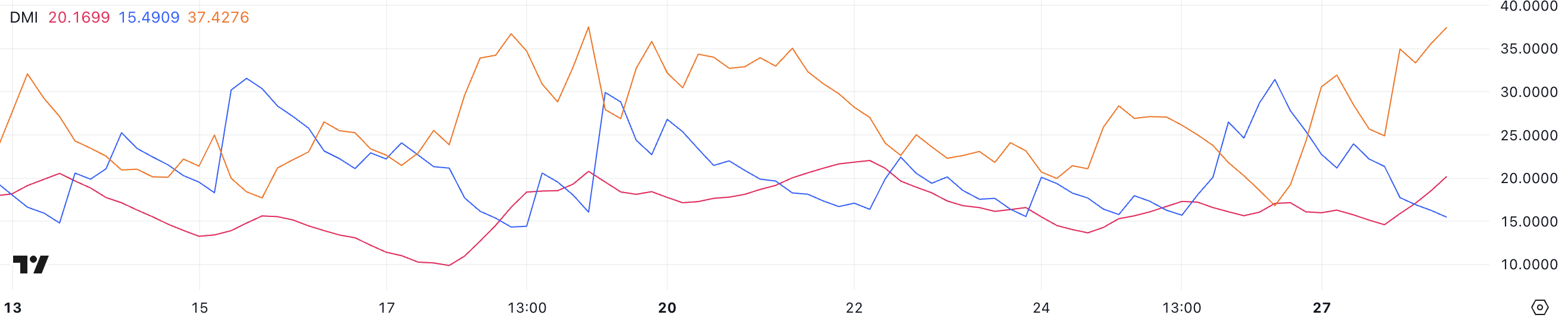 PENGUs DMI-diagram viser at ADX har steget til 20,16 fra 14,6 på bare én dag, noe som indikerer at styrken til den nåværende trenden øker.