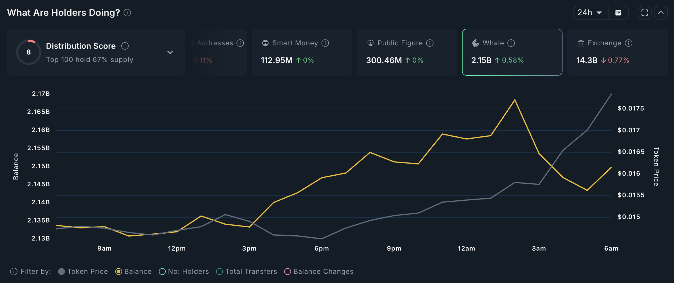 Denne gruppen holder nå 2,15 milliarder tokens, som representerer 2,8 % av meme coinens sirkulerende forsyning. Selv om akkumuleringen er subtil, signaliserer økt hvaltilstedeværelse økende tillit og kan gi kortsiktig prissupport hvis trenden fortsetter.