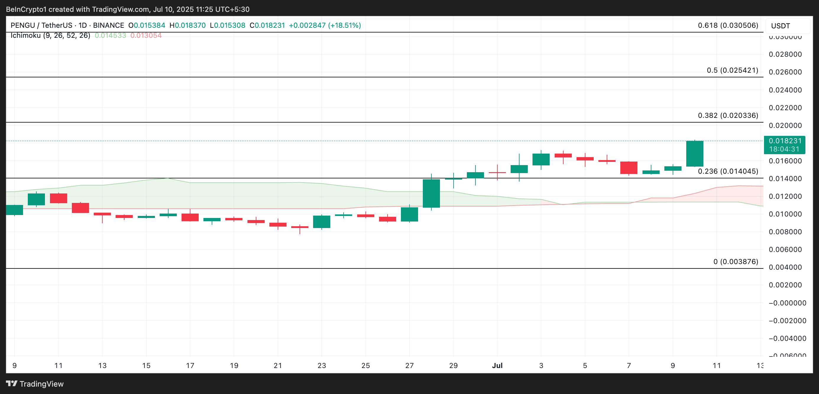 I skrivende stund handles PENGU til $ 0,018. Avlesninger fra PENGU/USD én-dags diagrammet viser at meme coinen bytter hender over sin Ichimoku Cloud.
