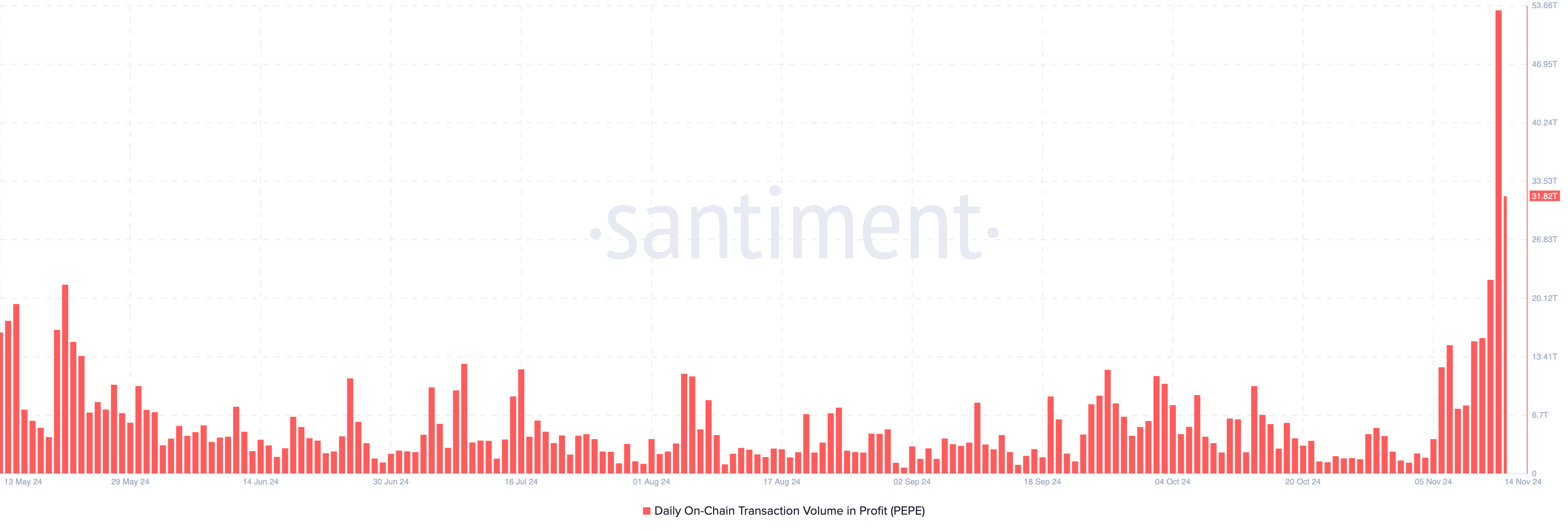 I tillegg førte PEPEs prisøkning til at transaksjonsvolumet i fortjeneste nådde $ 53,14 billioner, verdsatt til $ 1,16 milliarder. Fra et prisståsted indikerte en økning i denne metrikken salgspress. Derfor er det sannsynlig at tokenet vil oppleve en nedgang på kort sikt.