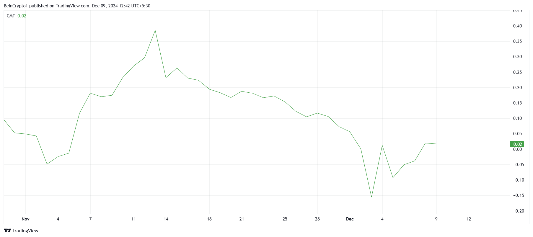 På makrofronten fremhever PEPEs tekniske indikatorer sterke innstrømninger, som vist ved at Chaikin Money Flow (CMF) har økt den siste uken. Etter nesten tre uker med dempet aktivitet er CMF nå over nøytral linje, noe som tyder på økt kjøpsinteresse. Denne økningen i innstrømninger har bidratt til PEPEs evne til å opprettholde sin oppadgående bane.
