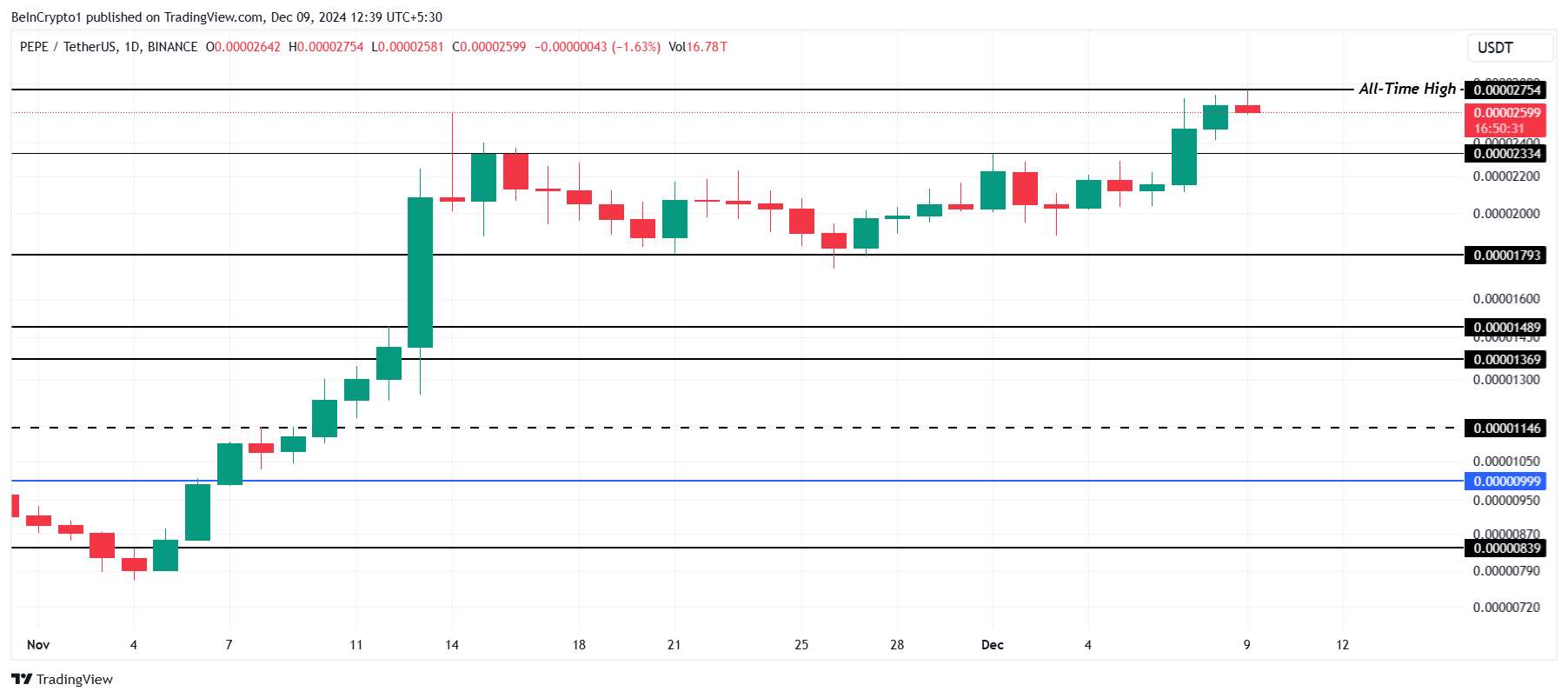 PEPE har opprettholdt sterk bullish momentum, og nylig dannet en ny all-time high (ATH) på $ 0,00002754. Altcoinens prisbevegelse har holdt seg nær sin ATH, støttet av investoroptimisme.