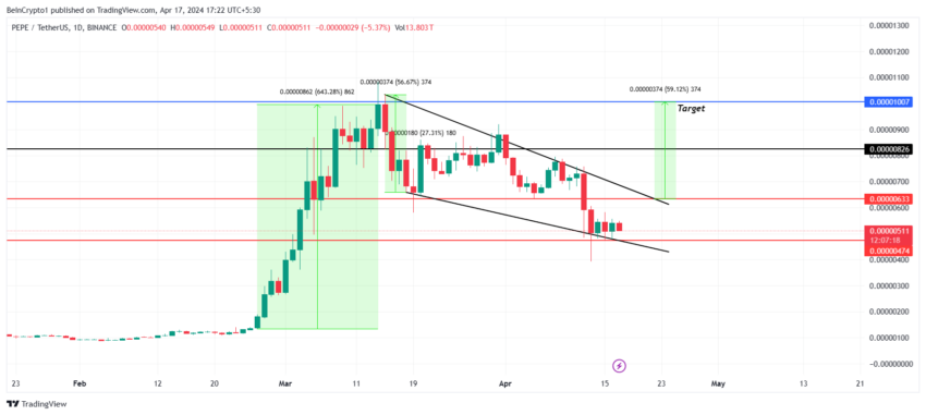 I skrivende stund beveger PEPE-prisen seg innenfor en synkende kile, og handles til $ 0.00000511. Også kjent som en fallende kile, er dette bullish reverseringsmønsteret preget av en smalere prisklasse med synkende høyder og nedturer, noe som antyder et potensielt oppadgående utbrudd.