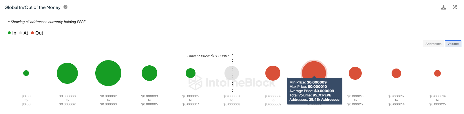Ved gjeldende pris er denne forsyningen verdt nær $ 880 millioner. Mellom $ 0.00000900 og $ 0.00001000 kjøpte investorer den største mengden forsyning, kryssende over 95.7 billioner PEPE. Det er imidlertid en sjanse for at all denne forsyningen kan bli lønnsom igjen.