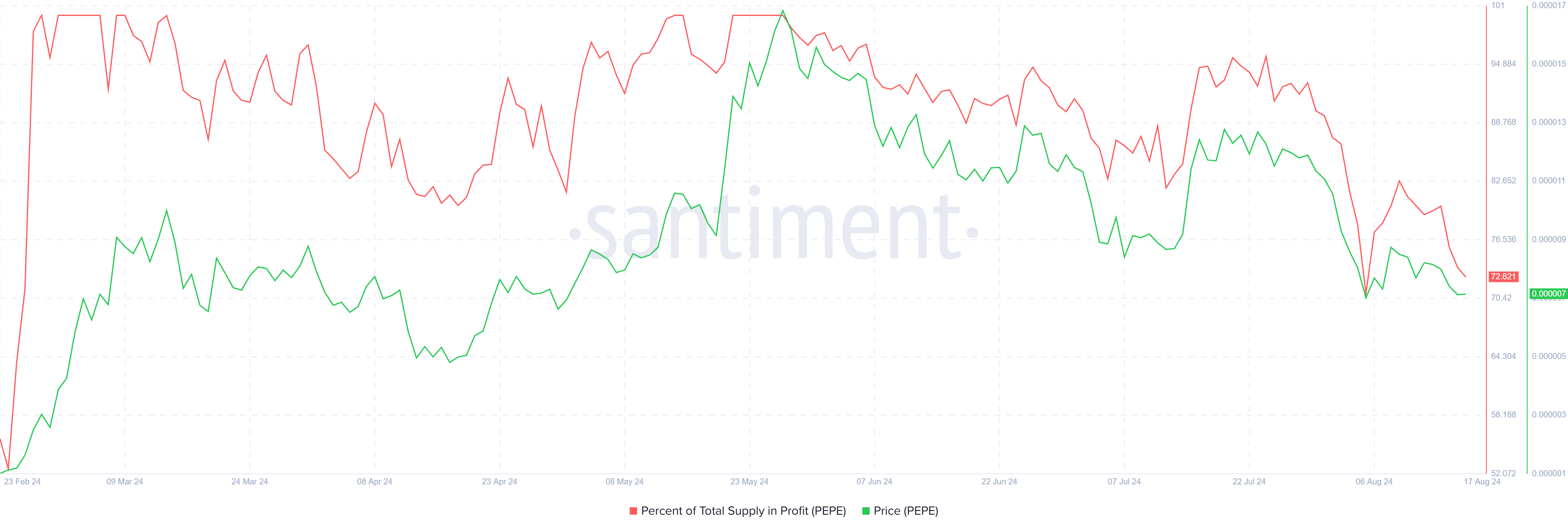 PEPE prisens nedgang førte til at verdier for millioner av dollar ble tapsgivende. Investorer over hele verden følte den samme effekten, ettersom den totale gevinstforsyningen falt til 72 %.