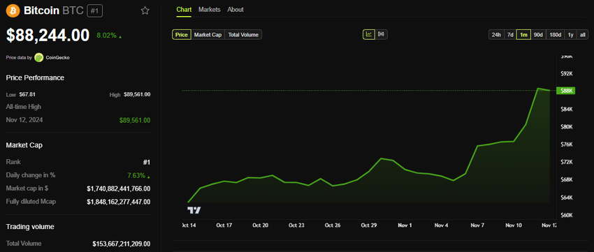 Samtidig viser Bitcoins verdi ingen tegn til å sakke av. Den har steget med over 8 % siden mandagens handel startet. I skrivende stund handles BTC for $ 88 244.