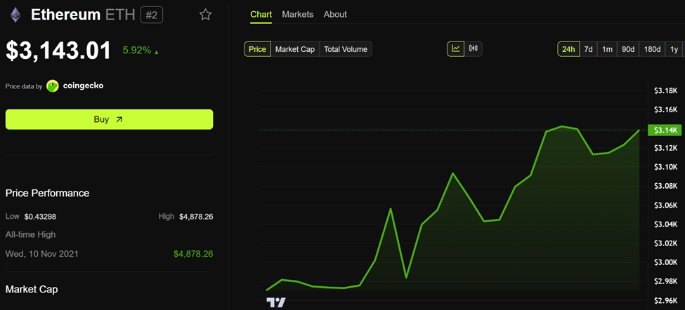 I skrivende stund handlet Ethereum for $ 3143, etter å ha steget nesten 6 % de siste 24 timene.