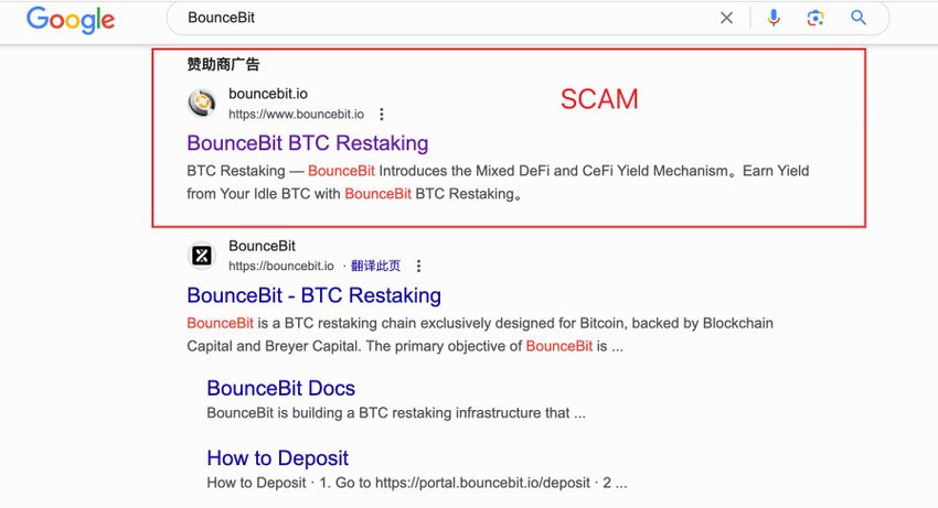 Imidlertid har et cybersikkerhetsvarsel temperert spenningen. Informasjons- og sikkerhetssjefen hos SlowMist, kjent som 23pds, har flagget en betydelig risiko. Det første Google-søkeresultatet for “BounceBit” er et phishing-nettsted kalt bouncbit.io, som utgjør en trussel mot brukernes sikkerhet.