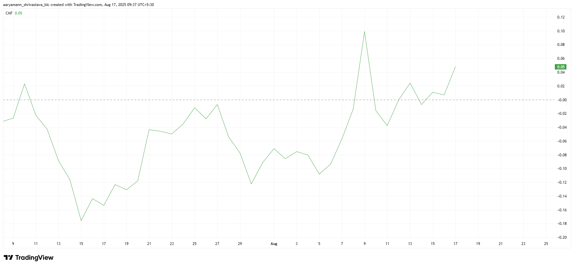 Til tross for bearish sentiment, viser Pi Coins makro momentum en viss motstandskraft. Chaikin Money Flow (CMF) indikatoren ligger for øyeblikket over null-linjen, noe som reflekterer sterkere innstrømninger i aktivaen.