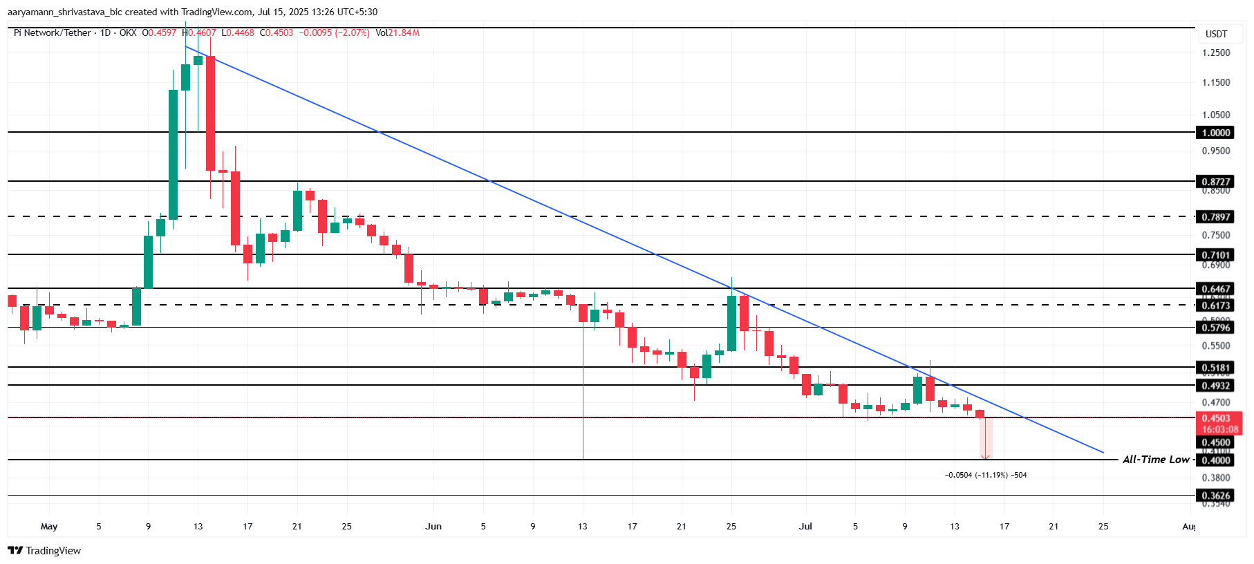 Pi Coin har opplevd en jevn nedgang de siste to månedene, uten tegn til oppgang i sikte. For øyeblikket handles Pi Coin til $ 0,45, farlig nær sin all-time low (ATL) på $ 0,40.