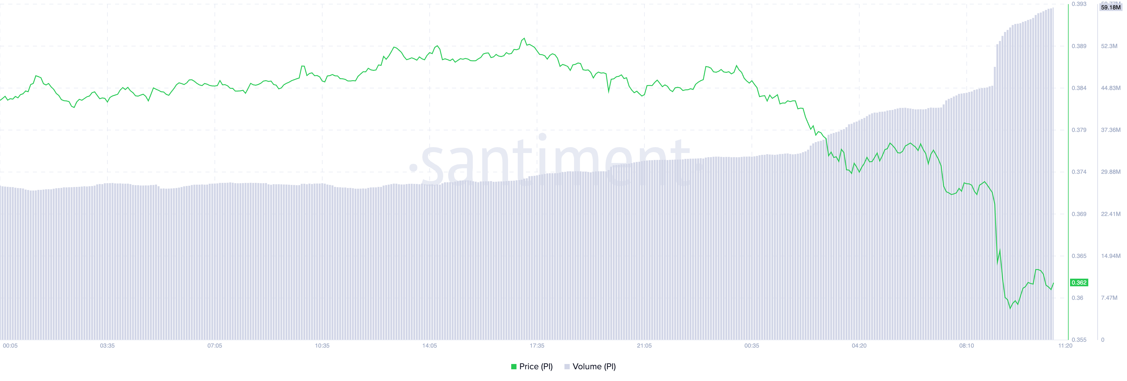 I skrivende stund handles PI til $ 0,36, med handelsvolumet som øker med 104 %. Et økende handelsvolum sammen med en fallende pris signaliserer økt salgspress, ettersom flere markedsdeltakere avvikler sine posisjoner.