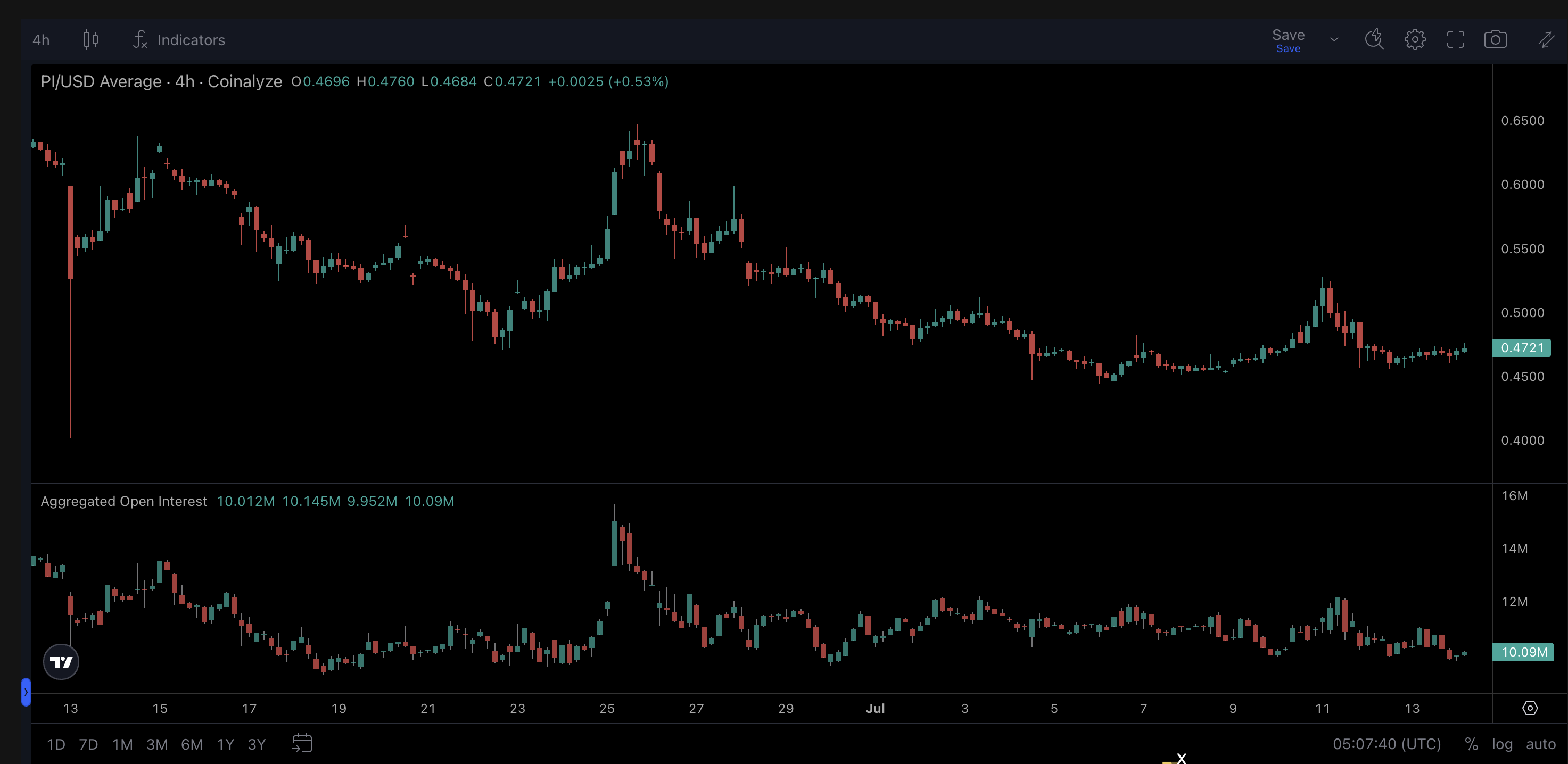 Pi Coin (PI) handles for øyeblikket til $ 0,4725, og svever like over det viktige støttenivået på $ 0,4452. Dette nivået ble avledet ved bruk av Fibonacci retracement-verktøyet, tegnet fra slutten av juni-høyden til lavpunktet 6. juli.