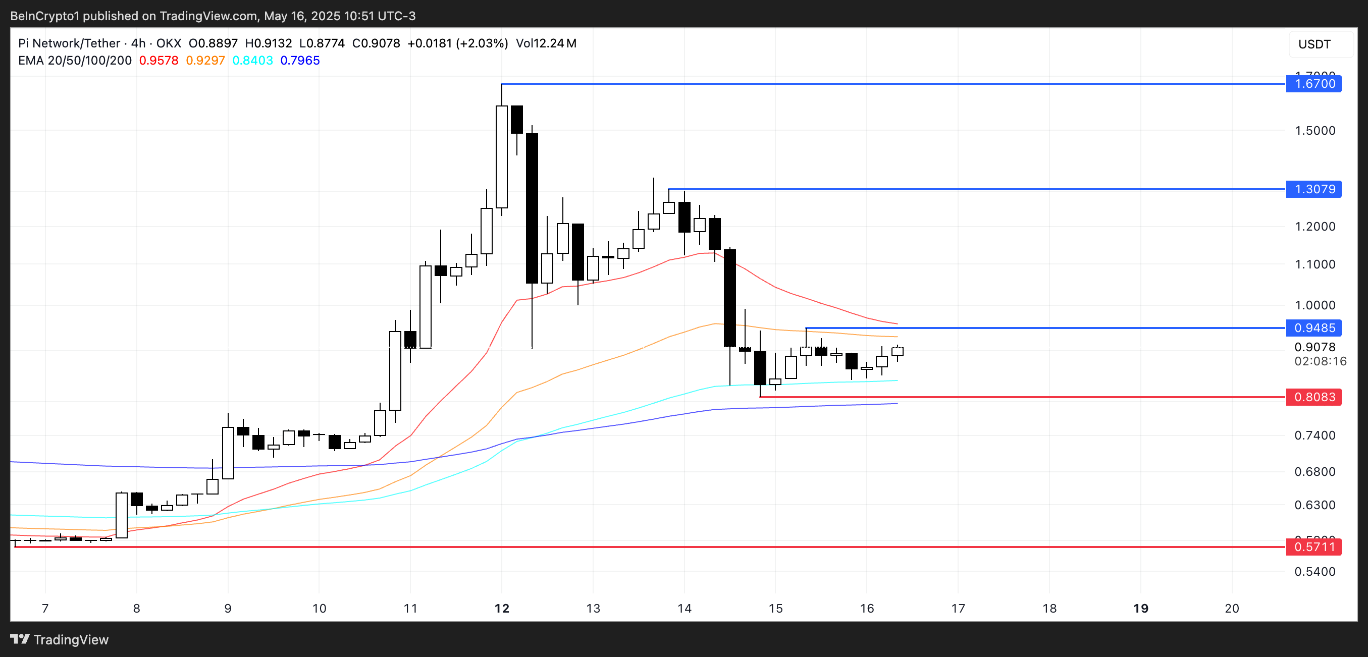 Teknisk sett støtter PI’s indikatorer det bearish synet. Momentumsignaler som DMI og CMF viser avtagende styrke og økt distribusjon, mens EMA-linjene strammer seg og antyder mulige dødskryss.