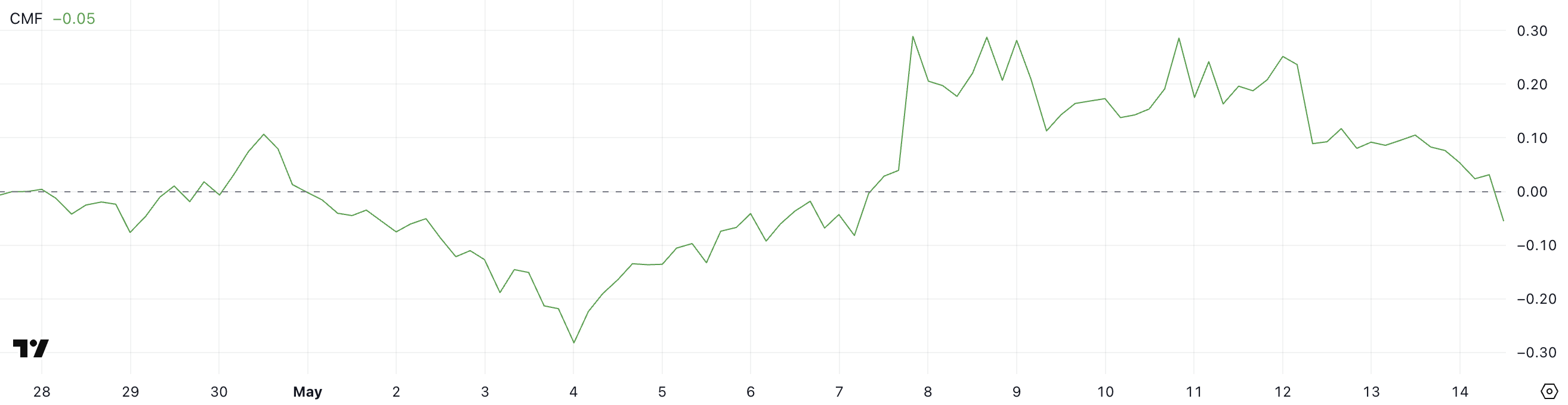 Hvis CMF fortsetter å falle, kan det antyde en kortsiktig pris korreksjon ettersom tradere tar gevinster etter den nylige oppgangen.