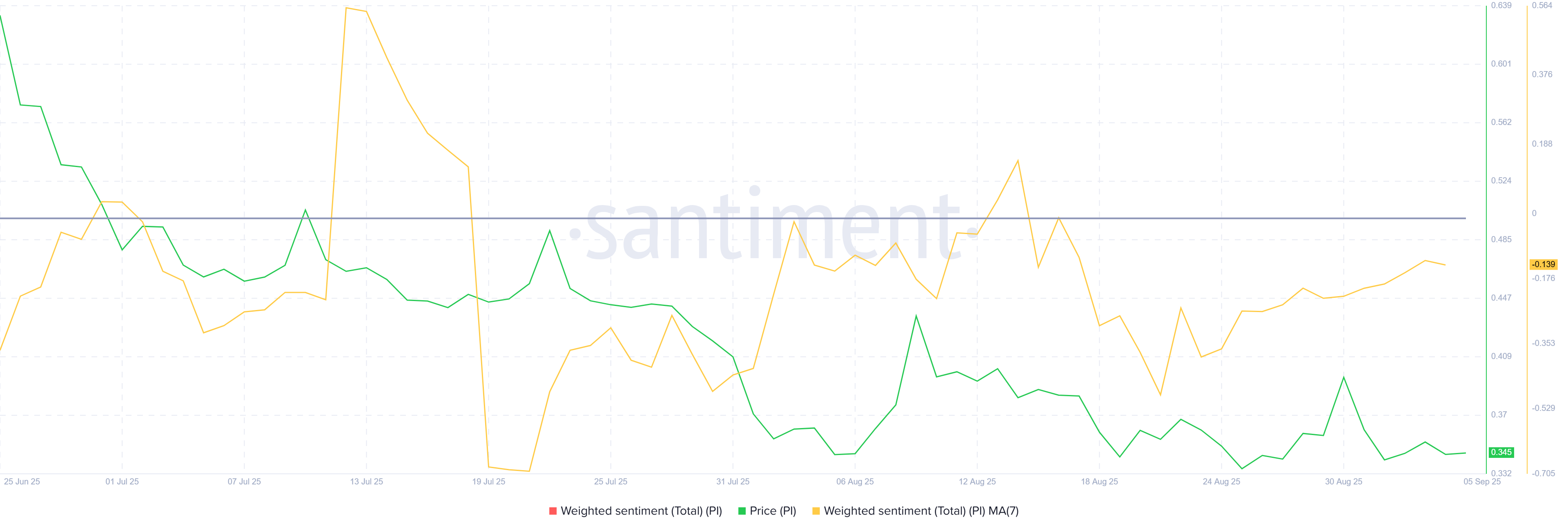 I skrivende stund handles Pi Coin til $ 0,345, og holder seg over sitt avgjørende støttenivå på $ 0,344. Denne linjen har fungert som et fundament i flere uker, og hjulpet altcoinen med å unngå å sette nye bunner til tross for pågående volatilitet.