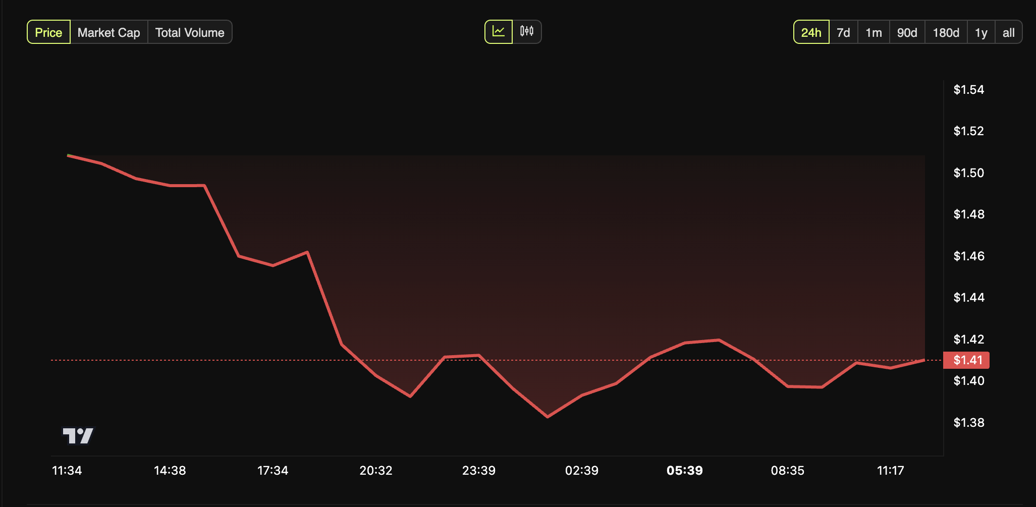I løpet av de siste 24 timene har PI falt med 7,1 %, og handles til $ 1,41 i skrivende stund. I løpet av de siste 14 dagene har mynten opplevd en tosifret nedgang på 16,7 %.