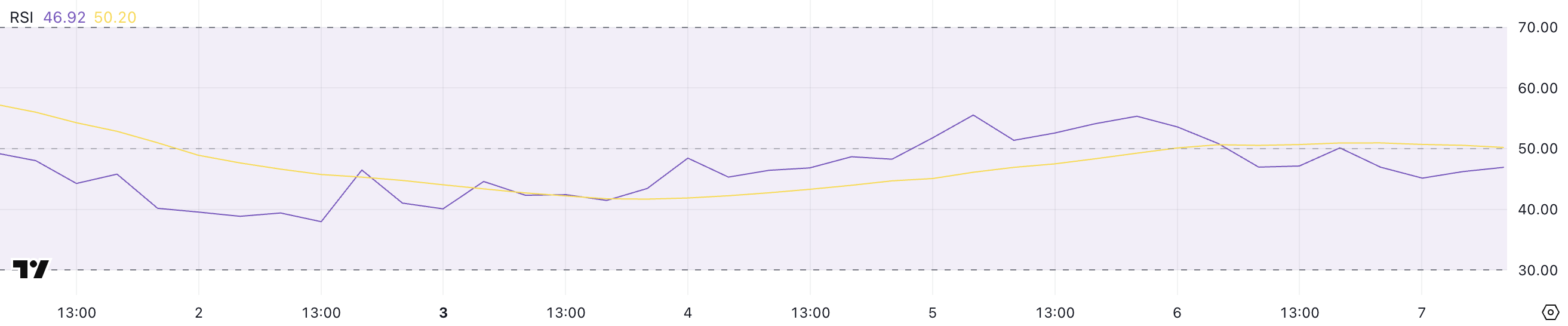 Pi Networks RSI er for øyeblikket på 46,9, og opprettholder en nøytral holdning siden 27. februar og svinger mellom 45 og 55 de siste tre dagene.