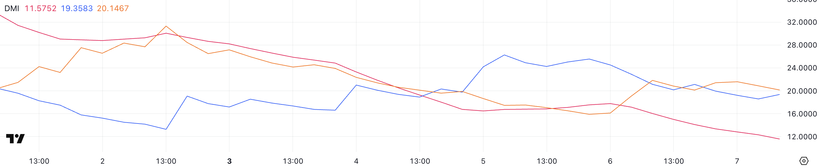 Pi Networks DMI-diagram viser at ADX har falt til 11,5, ned fra 17,7 dagen før.