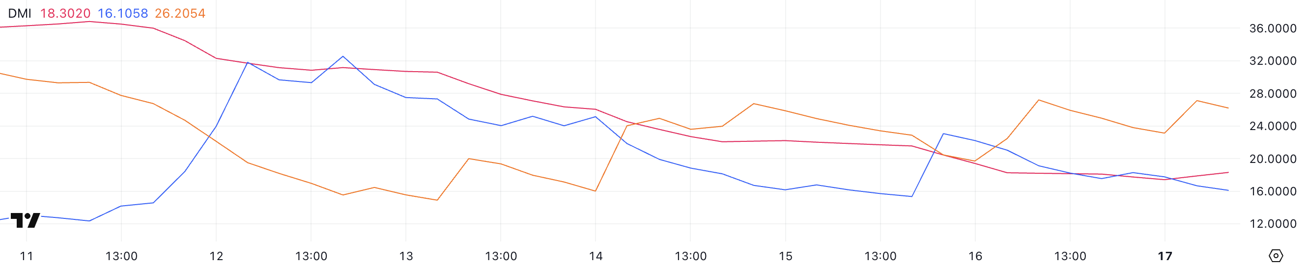 PIs DMI-diagram viser at ADX ligger på 18,3, et nivå det har holdt siden i går, noe som signaliserer en svak trend.