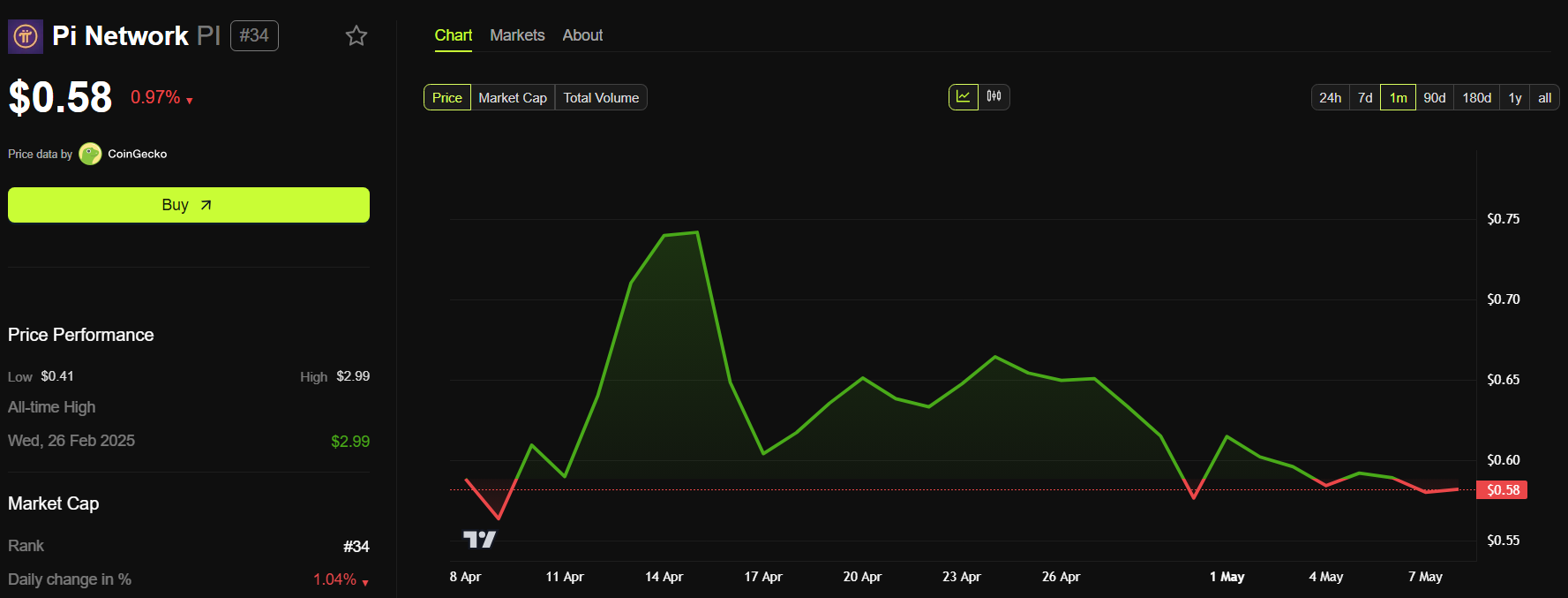 I skrivende stund forblir Pi-prisen stabil på rundt $ 0,58, slik den har vært siden begynnelsen av mai. Dette reflekterer den forsiktige holdningen til Pi tradere denne måneden.