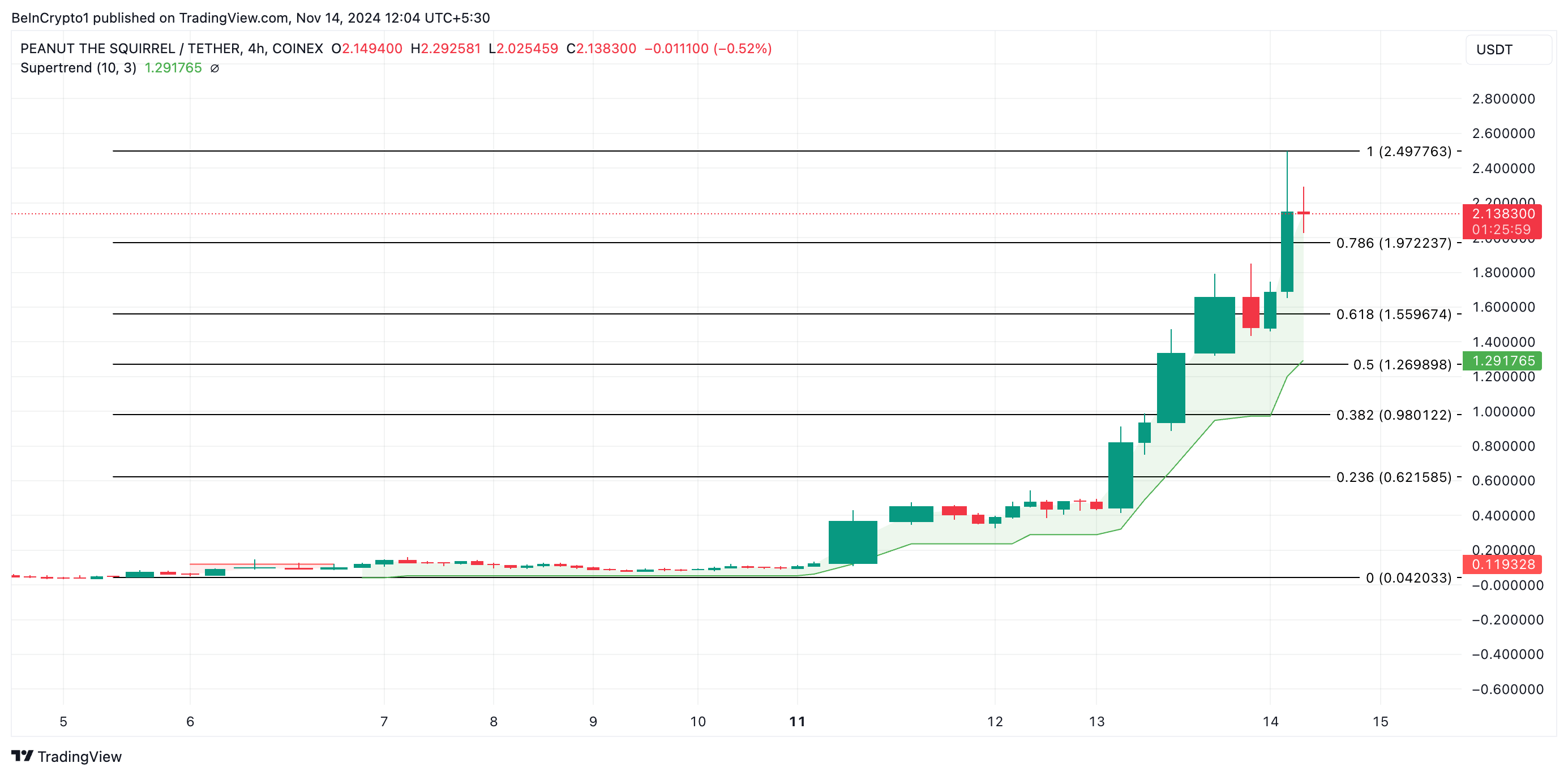 Med styrket kjøpspress reflektert av PNUTs Super Trend og Aroon-indikatorer, har meme coinen potensial til å utvide sine tresifrede gevinster. Ifølge dens Fibonacci Retracement-avlesninger, er PNUT-tokenets neste pris mål dens rekordhøyde på $ 2,49 hvis oppadgående trend holder. Vedvarende kjøpspress kan skyve den utover denne toppen.