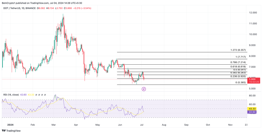 I skrivende stund byttet DOT hender på $5,87. På grunn av Polkadots nedgang i nettverksaktiviteten og den generelle markedsnedgangen, har altcoins verdi dyppet med 17% de siste 30 dagene.
