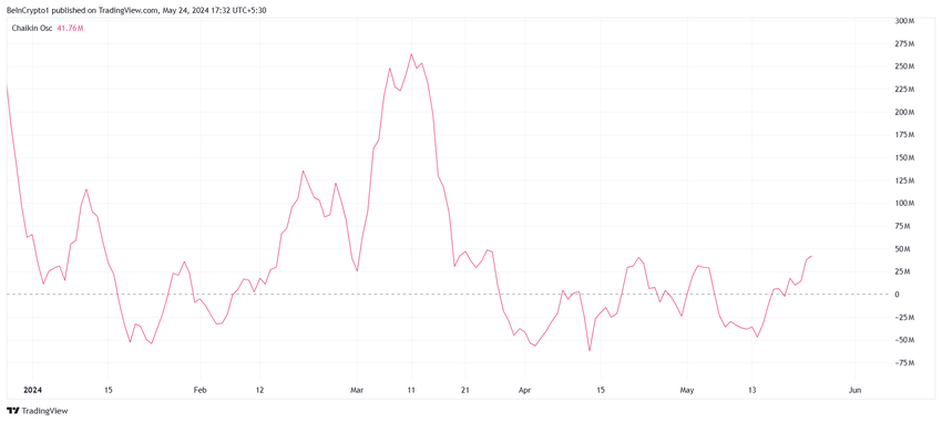 Dette kan observeres på Chaikin Oscillator, som noterer en uptick som krysser over akkumuleringsdistribusjonslinjen. Indikatoren måler momentumet i akkumuleringen og distribusjonen for å identifisere potensielle kjøps- og salgsmuligheter.