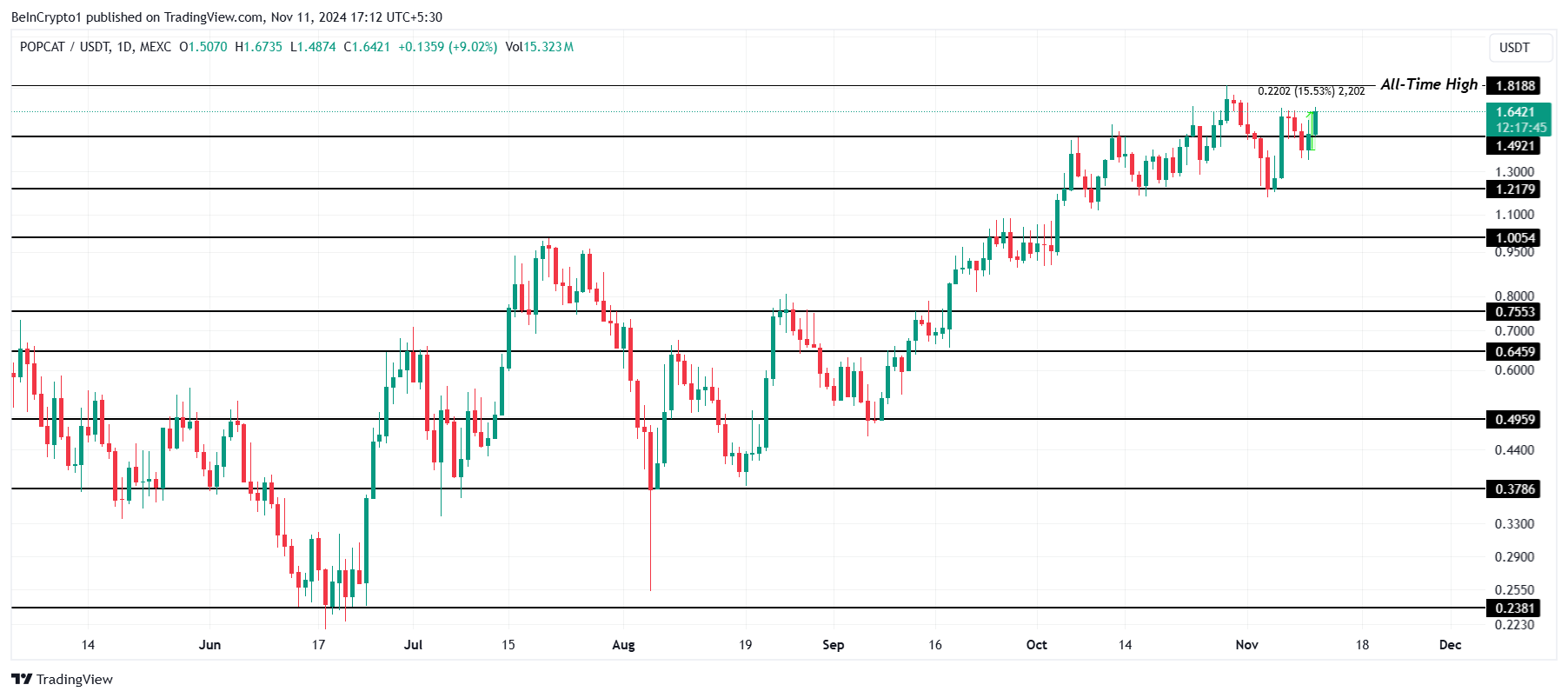 POPCATs pris nærmer seg nå sin historiske høyde på $ 1,81, noe som markerer en 15,5 % økning de siste 24 timene. Denne nylige oppgangen opprettholder den makro oppadgående trenden som begynte i midten av juni, og forsterker myntens bullish utsikter ettersom den tester nye nivåer.