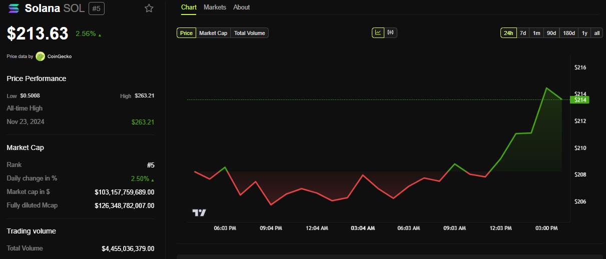 BeInCrypto-data viser at SOL ble handlet for $ 213,63 i skrivende stund, noe som representerer en beskjeden økning på 2,56 % siden fredagens sesjon åpnet. Per pressemeldingstidspunktet er Solanas pris opp nesten 12 % siden 1. januar, da den ble handlet for $ 189,31.