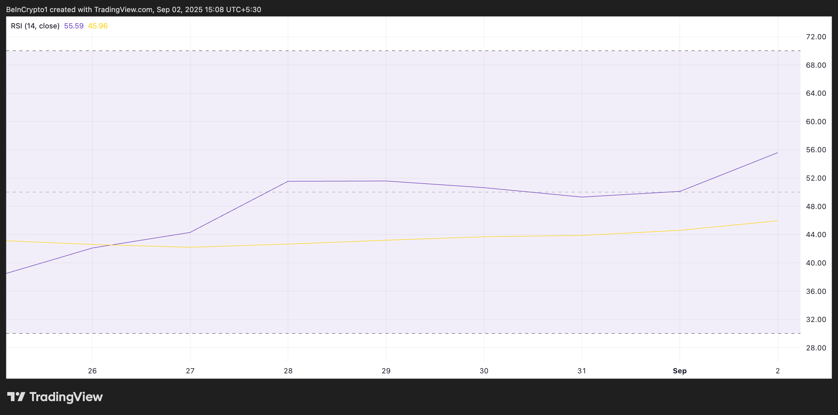 RSI-indikatoren måler en aktivas overkjøpte og oversolgte markedsforhold. Den varierer mellom 0 og 100. Verdier over 70 antyder at aktivaen er overkjøpt og kan oppleve en prisnedgang, mens verdier under 30 indikerer at aktivaen er oversolgt og kan oppleve en oppgang.