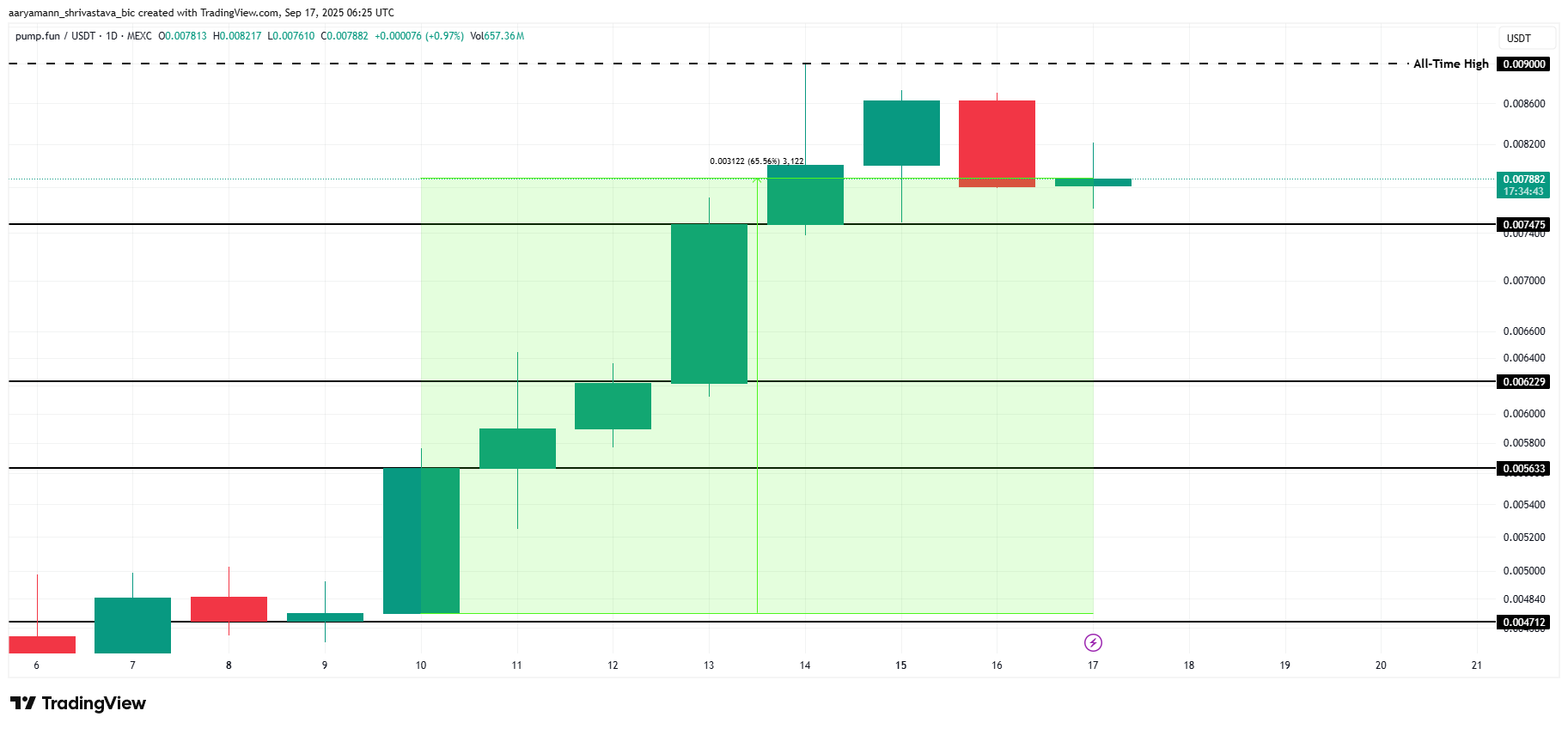 PUMP handles til $ 0,0078, og holder seg over støttenivået på $ 0,0074 etter å ha dykket kort fra en nylig topp. Tidligere denne uken dannet tokenet en ny ATH på $ 0,0090 før det avkjølte seg litt, noe som fremhever presset på høyere nivåer.