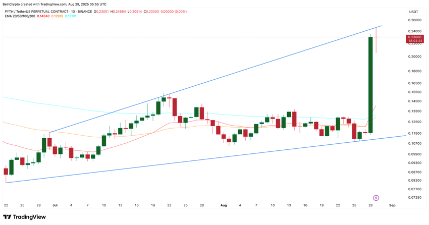 PYTH kursen steg mer enn 100 % de siste 24 timene, hjulpet av det amerikanske handelsdepartementets beslutning om å distribuere BNP-data på blokkjeder som Bitcoin, Ethereum og Solana, med Pyth Network som verifiserer data on-chain.