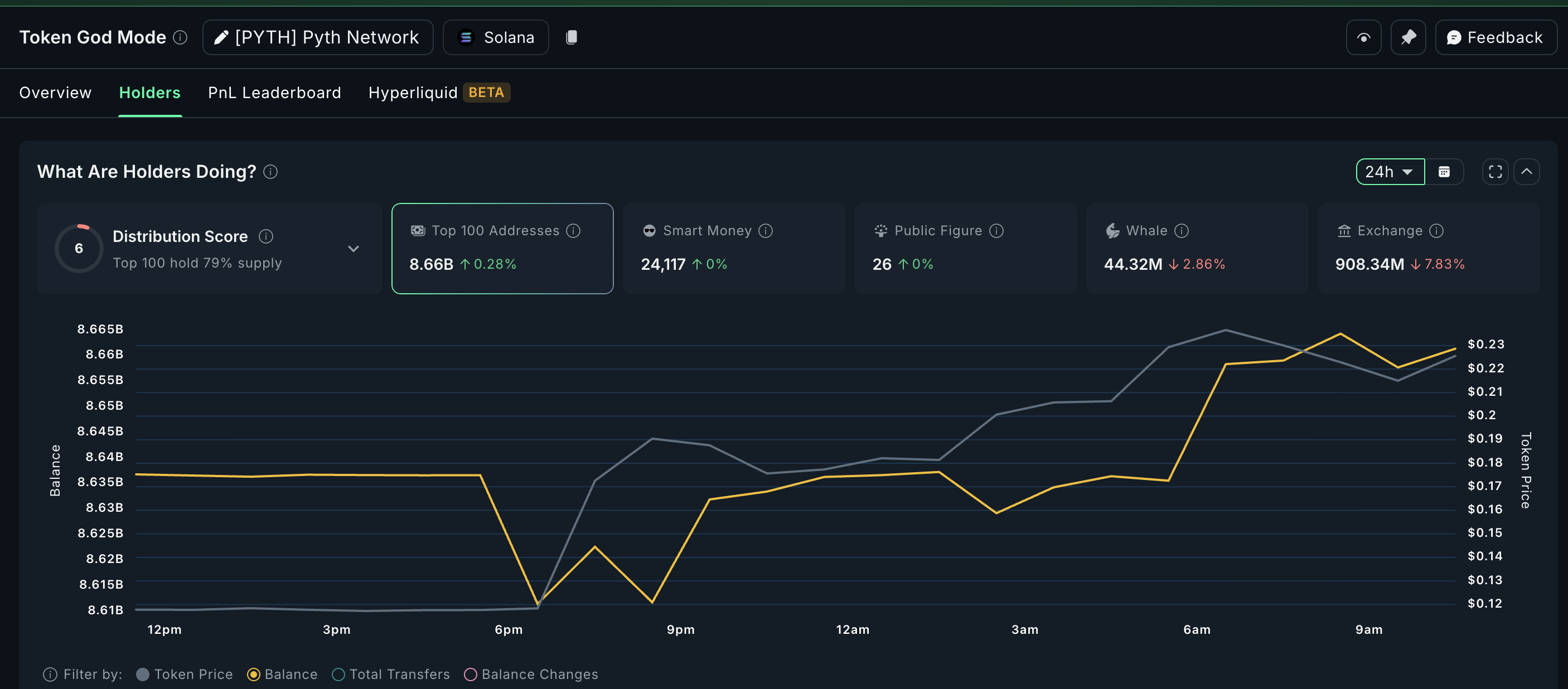 Samtidig la de 100 største adressene (en annen kategori av hvaler eller mega hvaler) til 24,1 millioner PYTH, verdt rundt $ 5,37 millioner. Samlet sett absorberte kjøpere mer enn $ 22 millioner verdt av tokens. Mens vanlige hvaler tok noe gevinst, forble den totale etterspørselen sterk.