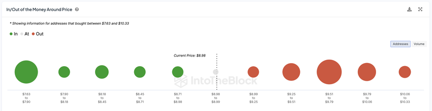 IOMAP peker på en betydelig støtte ved 7,63 dollar, noe som tyder på at dette kan være et nivå å falle tilbake til i tilfelle en nedadgående trend. I motsatt fall, i en oppadgående trend, står RNDR overfor en betydelig motstand ved 9,79 dollar, som markerer et potensielt mål før den møter et kraftig salgspress.