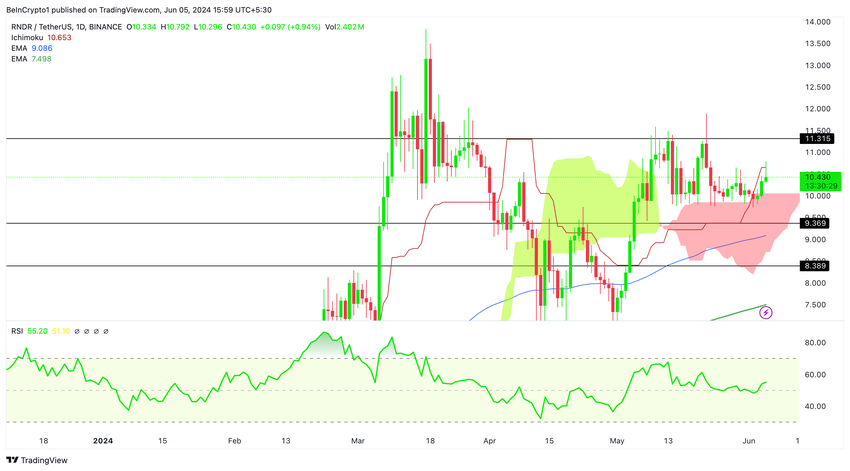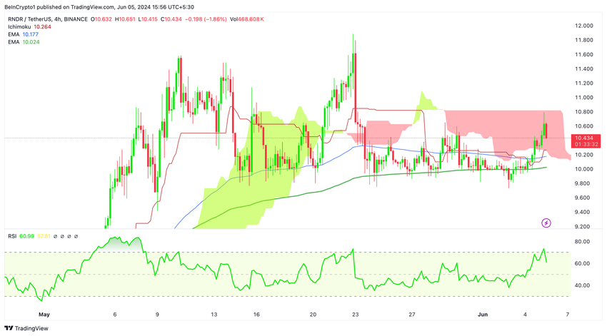 I går brøt RNDRs pris imidlertid over denne motstanden, steg oppover og trengte gjennom Ichimoku-skyen. Den testet skyens øvre grense, plassert på $ 10,8.