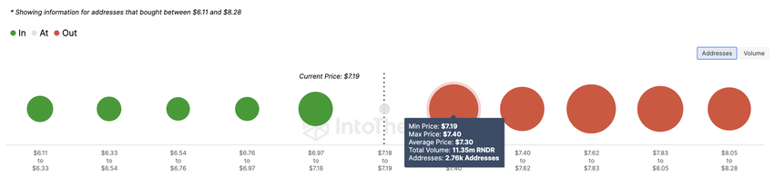 I skrivende stund er 2,760 adresser som kjøpte 11.35 millioner RNDR mellom $ 7.19 og $ 7.40 ute av pengene. Også 1,040 adresser som er i pengene kjøpte 6,84 millioner tokens mellom $6,97 og $7,18.