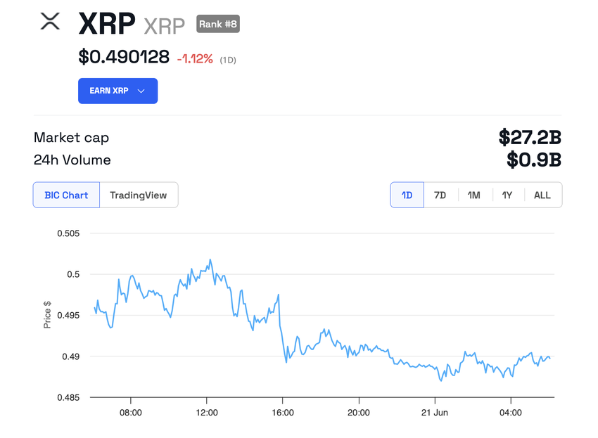 Til tross for domstolens avgjørelse har det ikke vært noen betydelig innvirkning på prisen på XRP så langt. I skrivende stund handles den til $0,4901, ned med rundt 1,12% de siste 24 timene.