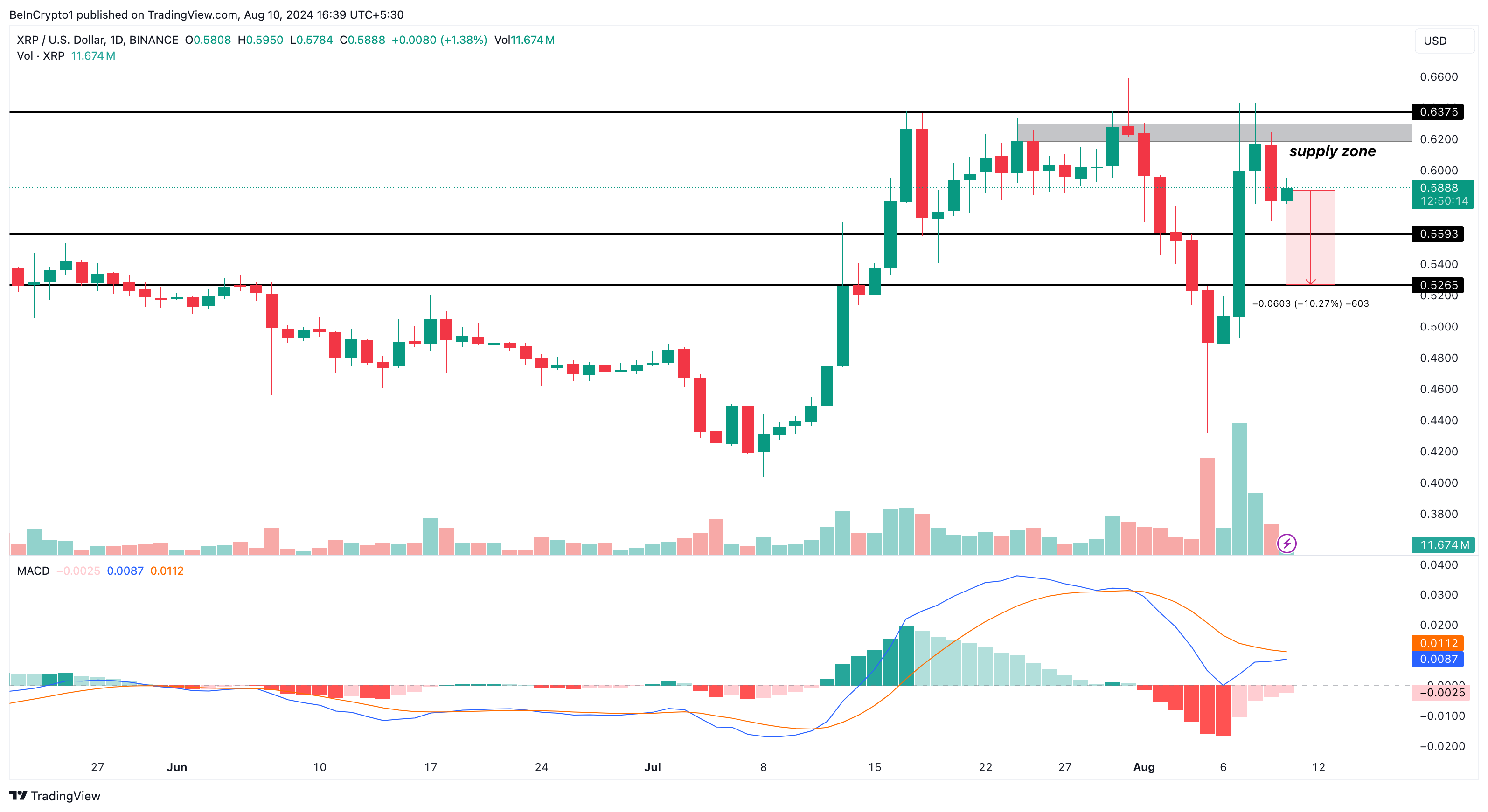 Ifølge det daglige diagrammet kunne tokenen ikke bygge på sin tidligere økning etter å ha truffet en forsyningsone rundt $ 0,62 og $ 0,63. Denne mangelen på etterspørsel førte til en avvisning som så prisen falle til $ 0,56 før en liten oppgang.